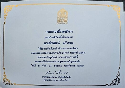 นายพีรพัฒน์ แก้วทอง นักเรียนชั้นมัธยมศึกษาปีที่ 6 โรงเรียนโสตศึกษาปานเลิศ จังหวัดลพบุรี เข้ารับเกียรติบัตรเด็กและเยาวชนดีเด่น ประจำปี 2569 จากศาสตราจารย์นฤมล ภิญโญสินวัฒน์ รัฐมนตรีว่าการกระทรวงศึกษาธิการ