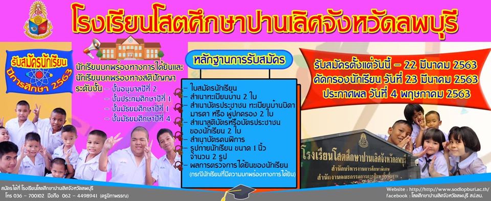 ตามที่ประกาศกระทรวงศึกษาธิการ เรื่องให้สถานศึกษาในสังกัดและในกำกับของกระทรวงศึกษาธิการปิดเรียนด้วยเหตุพิเศษ ณ วันที่ 17 มีนาคม 2563 นั้น ทางโรงเรียนโสตศึกษาปานเลิศจังหวัดลพบุรี จึงขอเปิดการรับสมัครนักเรียนประจำปีการศึกษา 2563 ในระบบออนไลน์เพื่อลดการแพร่ระบาดจากสถานการณ์ไวรัสโคโรน่าสายพันธุ์ใหม่ 2019 (รายละเอียดตามลิงค์ที่แนบ) |