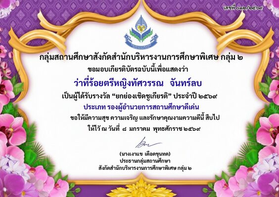 ได้รับรางวัล "ยกย่องเชิดชูเกียรติ" ประจำปี 2569 ประเภท ผู้บริหารสถานศึกษาดีเด่น